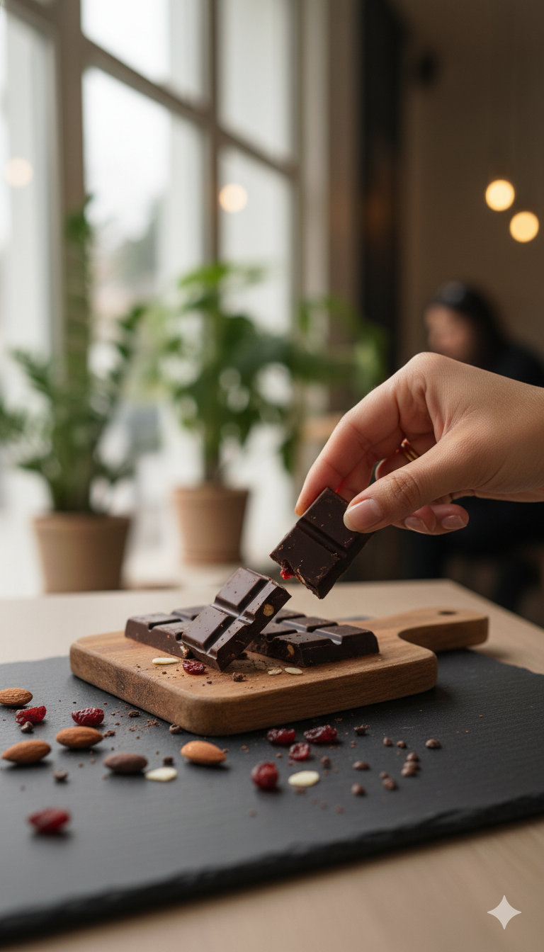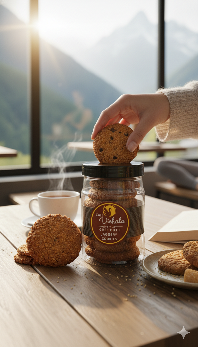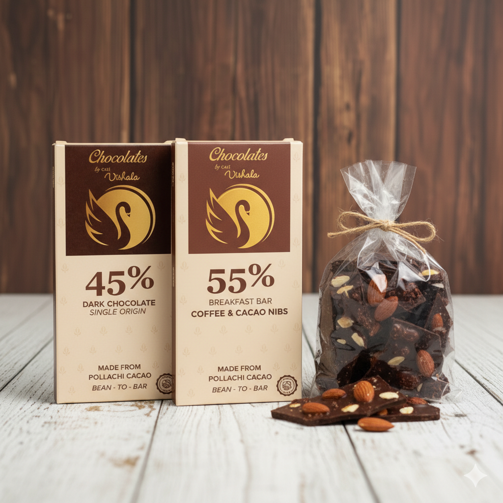Our journey begins at the foothills of Pollachi, where we source single-origin cacao directly from sustainable, mineral-rich farms. But the secret isn't just in the soil. Every batch of our bean-to-bar chocolate and artisan cookies is mindfully crafted by meditators, ensuring that the energy in your food is as clean and balanced as the ingredients themselves. No chemicals, no industrial rush—just pure, slow-made nourishment for your best self."